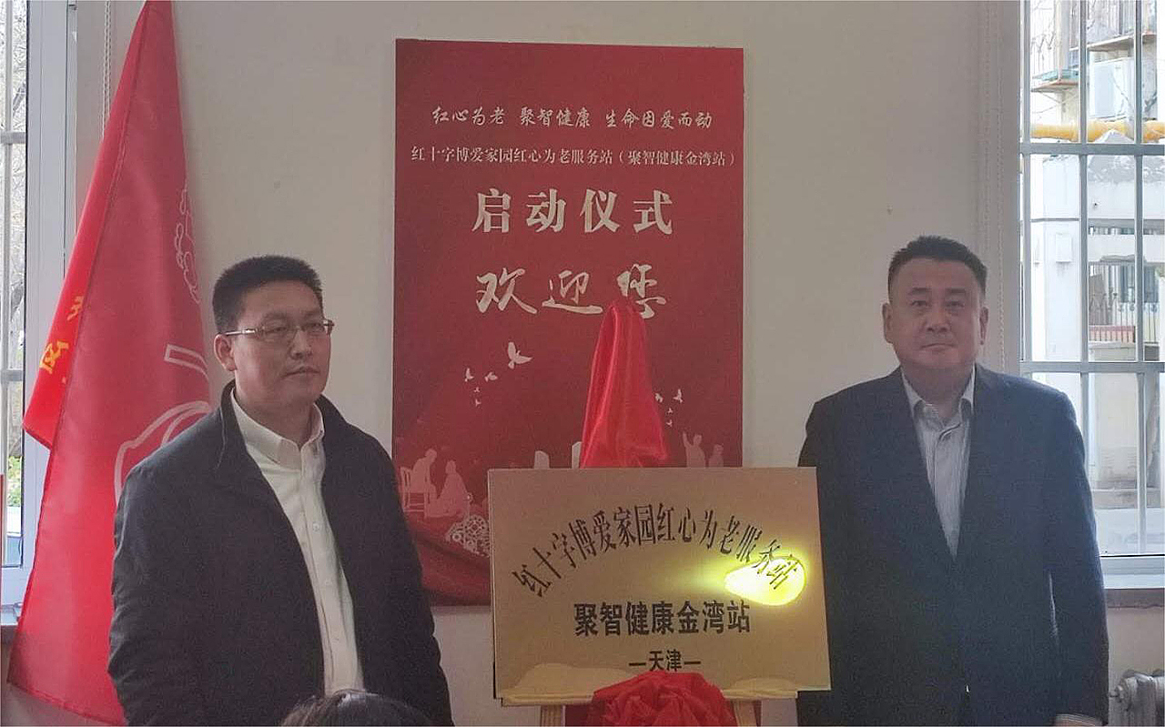 在与会嘉宾的见证下,天津市民政局养老服务处处长庞雨生与金年会金字招牌公益基金会秘书长叶军共同为红十字博爱家园红心为老服务站聚智健康金湾站揭牌。